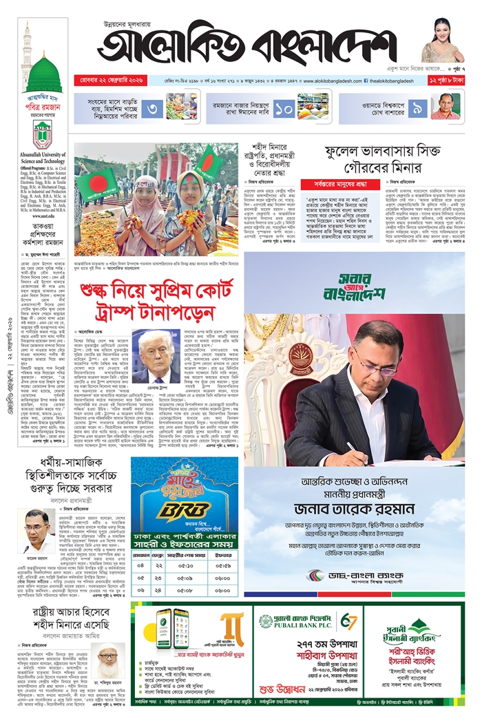 আগামী ২৬ ফেব্রুয়ারি অনুষ্ঠিতব্য অমর একুশে বইমেলার উদ্বোধন ও একুশে পদক প্রদান করবেন প্রধানমন্ত্রী তারেক রহমান। শনিবার (২১ ফেব্রুয়ারি) সংস্কৃতি মন্ত্রী নিতাই রায় চৌধুরী এ তথ্য জানান। সংস্কৃতি মন্ত্রী বলেন, ২৬ ফেব্রুয়ারি বইমেলার আনুষ্ঠানিক উদ্বোধন হবে। বিকেলে বাংলা একাডেমি প্রাঙ্গণে আয়োজিত অনুষ্ঠানে প্রধানমন্ত্রী তারেক রহমান প্রধান অতিথি হিসেবে উপস্থিত...বিস্তারিত