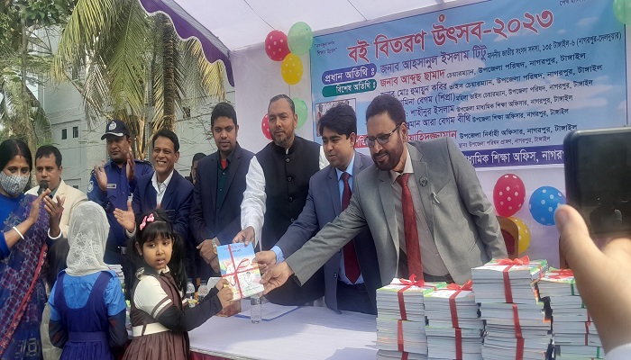 “বঙ্গবন্ধুর দর্শন শিক্ষার উন্নয়ন, শিক্ষা নিয়ে গড়ব দেশ শেখ হাসিনার বাংলাদেশ”এই প্রতিপাদ্য সামনে নিয়ে টাঙ্গাইলের নাগরপুরে সারা দেশের ন্যায় বই বিতরণ উৎসব- ২০২৩ অনুষ্ঠিত হয়েছে। রবিবার (১জানুয়ারি) উপজেলা প্রশাসন, উপজেলা প্রাথমিক ও মাধ্যমিক শিক্ষা অফিস উপজেলা চত্বরে এ বই উৎসবের আয়োজন করেন । উপজেলা নির্বাহী অফিসার (ইউএনও) ওয়াহিদুজ্জামান এর সভাপতিত্বে ও প্রাথমিক সহকারি শিক্ষা অফিসার জিএম ফুয়াদ এর পরিচলনায় বই উৎসবে অতিথি হিসেবে উপস্থিত ছিলেন টাঙ্গাইল-৬ (নাগরপুর-দেলদুয়ার) আসনের সংসদ সদস্য আহসানুল ইসলাম টিটু। আরো উপস্থিত ছিলেন, সহকারি কমিশনার (ভূমি) মো. ইকবাল হোসেন, উপজেলা পরিষদের ভাইস চেয়ারম্যান মো. হুমায়ুন কবির, নাগরপুর থানার তদন্ত কর্মকর্তা মো. হাসান সরকার জাহিদ, মাধ্যমিক শিক্ষা অফিসার মো.শাহীনুর ইসলাম , প্রাথমিক শিক্ষা অফিসার আঞ্জুমান আরা বেগম বীথি।