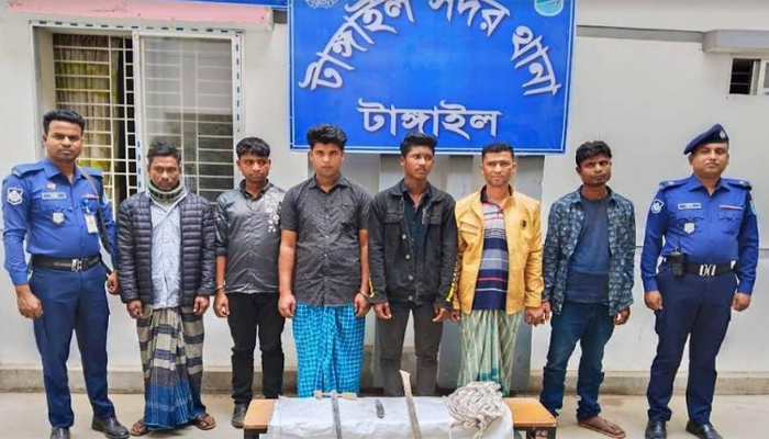 গ্রেফতারকৃতরা হলেন- সিরাজগঞ্জ জেলার বেলকুচি থানার ক্ষিদ্র মাটিয়ার মোতালেবের ছেলে ইউসুব আলী (৪২), পাবনা জেলার ফরিদপুর উপজেলার ধানুয়াঘাটা গ্রামের আব্দুর রহমানের ছেলে নুরুল ইসলাম (৩৬), টাঙ্গাইল সদর উপজেলার বাঘিল ইউনিয়নের কাঠুয়াযুগনি গ্রামের আলী হোসেনের ছেলে জুয়েল (৩১), একই গ্রামের সুরুত আলীর ছেলে সহিদুল ইসলাম (৩০), টাঙ্গাইল সদর উপজেলার কাতুলী ইউনিয়নের ধীতপুর গ্রামের জহর আলীর ছেলে সিরাজুল ইসলাম (৩০) ও টাঙ্গাইল সদর উপজেলার বাঘিল ইউনিয়নের কাঠুয়াযুগনি গ্রামের সাইফুল ইসলামের ছেলে ইদুল মিয়া (২০)।