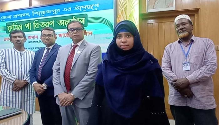 জন্মসূত্রে একটি পা হারানো এইচ এস সি পাশ মানছুরা আক্তারকে একটি কৃত্রিম পা বিতরণ করেন পিরোজপুরের জেলা প্রশাসক মোহাম্মদ জাহেদুর রহমান।