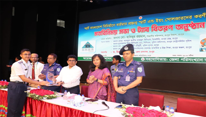 রংপুরে স্মার্ট বাংলাদেশ বিনির্মাণে বর্তমান প্রজন্ম স্মার্ট এন্ড ইয়ং সোলজারদের করণীয় শীর্ষক মতবিনিময় সভা ও ৮৬ টি ট্যাব বিতরণ করা হয়। মঙ্গলবার (১৬ মে) দুপুরে জেলা শিল্পকলা একাডেমিতে পরিসংখ্যান অফিসের সহযোগীতায় জেলা প্রশাসক আয়োজিত অনুষ্ঠানে প্রধান অতিথি হিসেবে উপস্থিত ছিলেন রংপুর বিভাগীয় কমিশনার হাবিবুর রহমান।