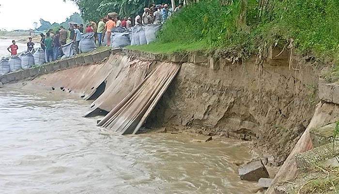 সিরাজগঞ্জে নদীর তীর সংরক্ষণ বাঁধে ৭০ মিটার জুড়ে ধস