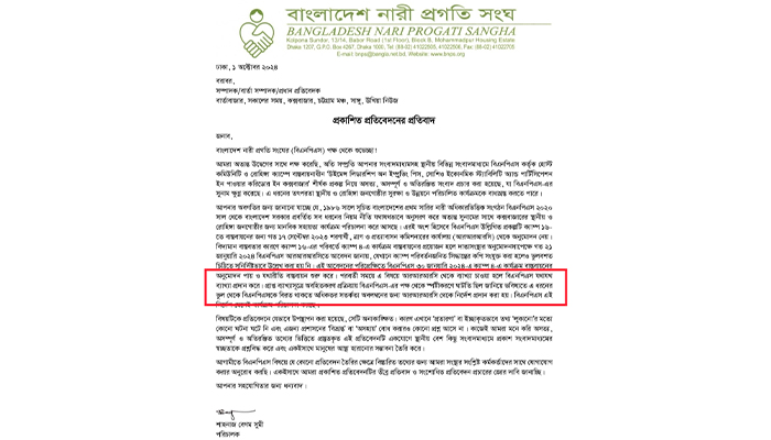 প্রতিবেদনকে কেন্দ্র করে প্রতিবাদলিপি দেন বিএনপিএস এর পরিচালক শাহনাজ বেগম সুমী৷