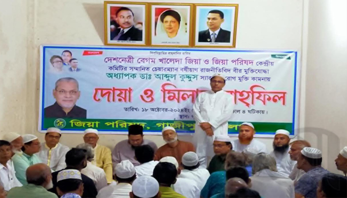 বিএনপি চেয়ারপারসন বেগম খালেদা জিয়া ও জিয়া পরিষদের চেয়ারম্যান বীর মুক্তিযোদ্ধা অধ্যাপক ডা. আব্দুল কুদ্দুসের রোগমুক্তি কামনায় গাজীপুরের শ্রীপুরে দোয়া মাহফিল ও আলোচনা সভা অনুষ্ঠিত হয়েছে।