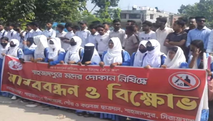 সিরাজগঞ্জের শাহজাদপুরে মদের দোকান নিষিদ্ধের দাবিতে মানববন্ধন ও বিক্ষোভ মিছিল অনুষ্ঠিত হয়েছে।