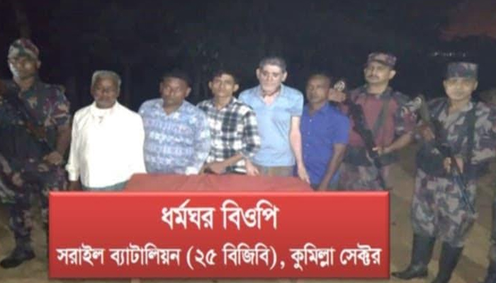 অবৈধভাবে সীমান্ত দিয়ে ভারতে পালানোর সময় দালালসহ ৫ জন বাংলাদেশী নাগরিকে আটক করেছে সরাইল ব্যাটালিয়ন (২৫ বিজিবি) সদস্যরা। মঙ্গলবার (২৯ অক্টোবর) সকালে মাধবপুর দেবনগর এলাকা থেকে তাদেরকে আটক করা হয়।