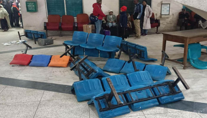 রেলের রানিং স্টাফদের কর্মবিরতির মুখে সারাদেশে বন্ধ হয়ে গেছে ট্রেন চলাচল। এমন পরিস্থিতিতে ক্ষুব্ধ হয়ে রাজশাহী স্টেশনে ভাঙচুর চালিয়েছেন যাত্রীরা।