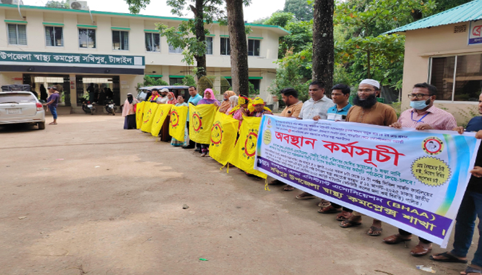 বাংলাদেশ হেলথ অ্যাসিস্ট্যান্ট এসোসিয়েশনের কেন্দ্রীয় কর্মসূচির অংশ হিসেবে ছয় দফা দাবিতে সখীপুর উপজেলার স্বাস্থ্য সহকারীরা অবস্থান কর্মসূচি পালন করেছেন।