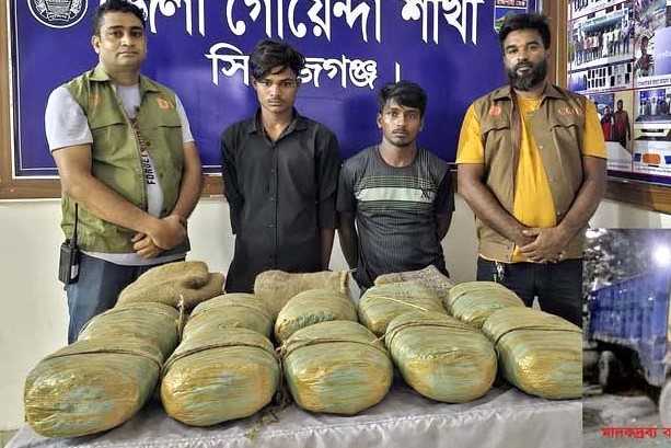 যমুনা সেতু পশ্চিমপাড় সংযোগ মহাসড়কের সিরাজগঞ্জ সদর উপজেলার কড্ডার মোড় এলাকায় অস্থায়ী চেকপোস্ট বসিয়ে ২০ কেজি গাঁজাসহ ২ মাদক কারবারিকে গ্রেফতার করেছে ডিবি পুলিশ। তারা হলো, চাঁপাইনবাগঞ্জের গোমস্তাপুর উপজেলার শিমুলতলা বালু গ্রামের আকলু মিয়া সুমন (২১) ও শিবগঞ্জ উপজেলার গুপ্তমানিক ঘন্টলা গ্রামের শহাব আলী (১৯)। ওসি (ডিবি) একরামুল হোসাইন এ তথ্য নিশ্চিত করেছেন। তিনি আলোকিত বাংলাদেশকে জানান, গোপন সংবাদের ভিত্তিত্তে পুলিশ সুপার মোঃ ফারুক হোসেনের দিকনির্দেশনায় রোববার গভীর রাতে উল্লেখিত স্থানে অস্থায়ী চেকপোস্ট স্থাপন করা হয় এবং সোমবার ভোর রাতে একটি ট্রাকে তল্লাশি চালিয়ে উল্লেখিত গাঁজাসহ তাদের গ্রেফতার করা হয়। এ সময় মাদক কাজে ব্যবহৃত ট্রাকটি জব্দ করা হয়েছে। তারা দীর্ঘদিন ধরে এ অবৈধ ব্যবসায় জড়িত ছিল। এ ব্যাপারে সংশ্লিষ্ট থানায় মামলা হয়েছে।