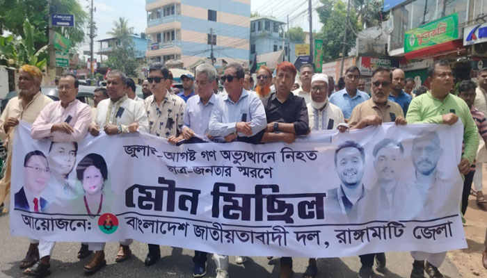 ২০২৪ সালের জুলাই-আগস্টের গণঅভ্যুত্থানে শহীদ ছাত্র-জনতার স্মরণে রাঙামাটিতে মৌন মিছিল ও সংক্ষিপ্ত সমাবেশ করেছে বাংলাদেশ জাতীয়তাবাদী দল-বিএনপি’র রাঙামাটি জেলা শাখা।
