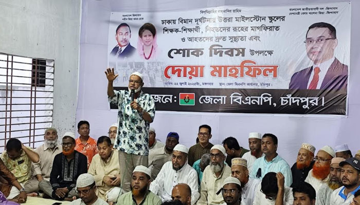 ঢাকায় বিমান দুর্ঘটনায় উত্তরা মাইলস্টোন স্কুলের শিক্ষক-শিক্ষার্থী, নিহতদের রুহের মাগফেরাত ও আহতদের দ্রুত সুস্থতা এবং শোক দিবস উপলক্ষ্যে দোয়া মাহফিলের আয়োজন করেছে চাঁদপুর জেলা বিএনপি।