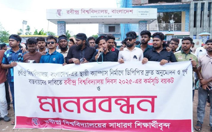 রবীন্দ্র বিশ্ববিদ্যালয়ের স্থায়ী ক্যাম্পাস নির্মাণে ডিপিপি'র দ্রুত অনুমোদন ও পূর্ণ বাস্তবায়নের দাবিতে রবীন্দ্র বিশ্ববিদ্যালয় দিবস-২০২৫ কর্মসূচি বয়কট করে মানববন্ধন করা হয়েছে। শনিবার দুপুরের দিকে রবির অস্থায়ী অ্যাকাডেমিক ভবন ৩-এর সামনে রবির শিক্ষক, শিক্ষার্থী, কর্মকর্তা ও কর্মচারীবৃন্দ এ মানববন্ধন করে। এ মানববন্ধনে রবির অর্থনীতি বিভাগের চেয়ারম্যান নজরুল ইসলাম বলেন, আজ প্রাণের প্রতিষ্ঠান রবির প্রতিষ্ঠাবার্ষিক। দিনটি উদযাপনে বিশ্ববিদ্যালয়ের কর্মসূচি পালনের মধ্য দিয়ে আজ একটি আনন্দঘন দিন হতে পারত। অথচ আজ রাজপথে অবস্থান নিয়েছি। রবির ডিপিপি অনুমোদনে সরকারের উদাসীনতা আজ এখানে দাঁড় করিয়েছে। রবির ডিপিপি অনুমোদন না হওয়া পর্যন্ত বিশ্ববিদ্যালয় দিবস উদযাপন করব না।