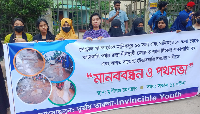 মুন্সীগঞ্জ পৌর শহরের গুরুত্বপূর্ণ সড়কগুলোর বেহাল দশা এবং দীর্ঘস্থায়ী সংস্কার না হওয়ায় ক্ষোভ প্রকাশ করেছেন এলাকাবাসী ও সমাজকর্মীরা। এসব সড়কের টেকসই মেরামতের দাবিতে মানববন্ধন কর্মসূচি পালন করেছে সামাজিক সংগঠন ‘দুর্জয় তারুণ্য’।