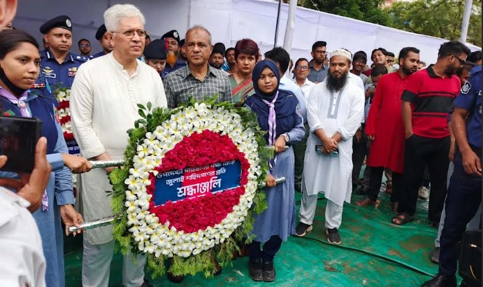 এর আগে জুলাই শহিদ স্মৃতিস্তম্ভে ফুলেল শ্রদ্ধা নিবেদন করেন শহিদ পরিবারের সদস্য ও উপদেষ্টাদ্বয়, ঢাকা রেঞ্জ ডি আইজি এবং স্থানীয় প্রশাসন।