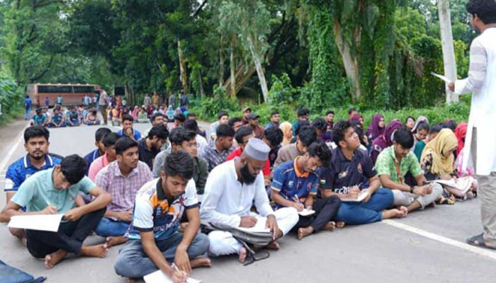 বগুড়া-নগড়বাড়ি মহাসড়কের সিরাজগঞ্জের শাহজাদপুরে মহাসড়কে দ্বিতীয় দিনেও শিক্ষার্থীদের পাঠদান করেছেন রবীন্দ্র বিশ্ববিদ্যালয়ের শিক্ষকগণ।