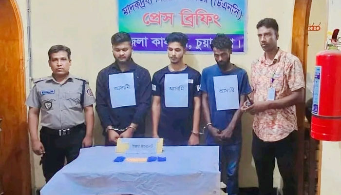 গ্রেপ্তারকৃতরা হলেন দামুড়হুদা উপজেলার দশমি গুলশানপাড়ার আনসার আলী মোল্লার ছেলে রাসেল মোল্লা পিন্টু (২৬), আসিকুর রহমান মিন্টুর ছেলে সবুজ (২৪) এবং দশমি পাড়ার তোফাজ্জল হোসেন মিন্টুর ছেলে জাহিদ হাসান (৩০)।