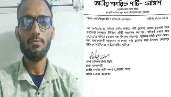 বিজ্ঞপ্তিতে বলা হয়, জাতীয় নাগরিক পার্টি চুয়াডাঙ্গা জেলার চুয়াডাঙ্গা সদর উপজেলার নেহালপুর ইউনিয়ন কমিটি অনিবার্য কারণে স্থগিত করা হল। পরবর্তী অনুমোদন না দেওয়া পর্যন্ত এই কমিটির সব কার্যক্রম স্থগিত থাকবে।