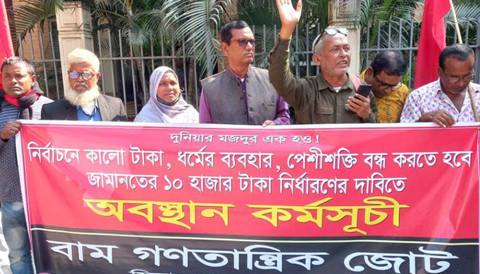 আসন্ন জাতীয় সংসদ নির্বাচনে প্রার্থীর ১০ হাজার টাকা জামানত নির্ধারণসহ ৫ দাবিতে অবস্থান কর্মসূচি পালন করেছে জেলা বাম গণতান্ত্রিক জোট।