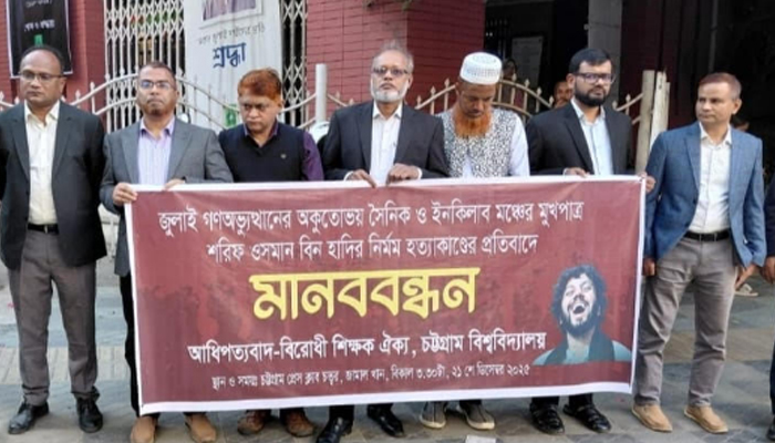 জুলাই বিপ্লবের অন্যতম নেতা ও ইনকিলাব মঞ্চের মুখপাত্র শহীদ শরীফ ওসমান বিন হাদীর নির্মম হত্যাকাণ্ডের বিচারের দাবিতে মানববন্ধন করেছে চট্টগ্রাম বিশ্ববিদ্যালয়ের (চবি) আধিপত্যবাদ বিরোধী শিক্ষক ঐক্য।