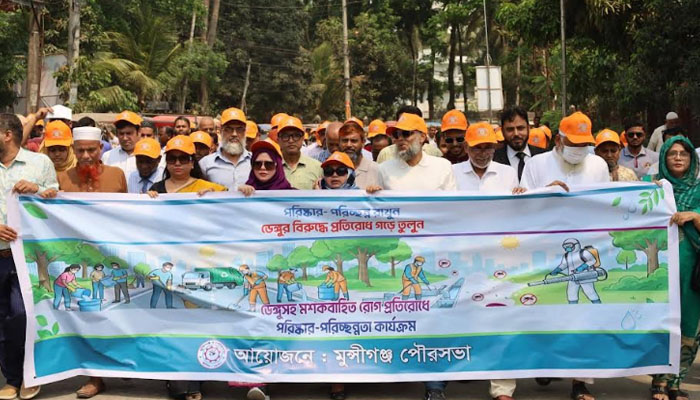 মুন্সীগঞ্জে ডেঙ্গুসহ অন্যান্য মশাবাহিত রোগ প্রতিরোধে পরিষ্কার-পরিচ্ছন্নতা বিষয়ে জনসচেতনতা সৃষ্টির লক্ষ্যে এক র্যালি অনুষ্ঠিত হয়েছে।