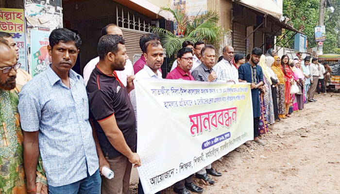 সাতক্ষীরা দিবা-নৈশ কলেজের অধ্যক্ষ এ.কে.এম সফিকুজ্জামানের ওপর সন্ত্রাসী হামলার প্রতিবাদে এবং দোষীদের দৃষ্টান্তমূলক শাস্তির দাবিতে মানববন্ধন কর্মসূচি পালিত হয়েছে।