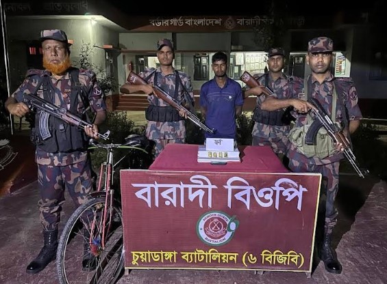 বিজিপি সূত্রে জানা যায়, শনিবার দিবাগত রাতে চুয়াডাঙ্গাস্ত ৬ ব্যাটালিয়নের অধিনায়ক লেফটেন্যান্ট কর্নেল মো, নাজমুল হাসানের নির্দেশে বারাদি বিজিপি ক্যাম্পের একটি টহল দল গোপন সংবাদের ভিত্তিতে উপজেলার সীমান্তবর্তী পাঁচ কবর নামক স্থানে অবস্থান নেয়। এ সময় এক ব্যক্তি বাইসাইকেল যোগে সীমান্তর দিকে অগ্রসর হলে তাকে বিজিপি সদস্যরা থামার জন্য বলে। এ সময় তিনি পালানোর চেষ্টা করলে বিজিপি সদস্যরা তাকে ধাওয়া করে আটক করে। তার দেহ তল্লাশি করে সবুজ টেপে মোড়ানো একটি পোটলা উদ্ধার করে। পোটলাটি খুলে ৪ টি স্বর্ণের বার পাওয়া যায়। ডিজিটাল স্কেলে ওজন করে মোট ৪ শ' ৫২ গ্রাম স্বর্ণ জব্দ করা হয়। বিজিবি আরো জানায়, উদ্ধার করা স্বর্ণের আনুমানিক মূল্য ৯৬ লাখ ৯ হাজার ৫২০ টাকা। এছাড়া আটক ব্যক্তির কাছ থেকে একটি মোবাইল ফোন ও একটি বাইসাইকেল জব্দ করা হয়েছে।
