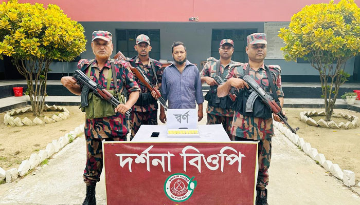 চুয়াডাঙ্গার দামুড়হুদা উপজেলার দর্শনা পৌর শহরে অভিযান চালিয়ে ১ কেজি ১৬৬ গ্রাম ওজনের ১০টি অবৈধ স্বর্ণের বারসহ আলঙ্গীর খান (৫৫) নামের এক স্বর্ণ চোরাচালানকারীকে আটক করেছে বর্ডার গার্ড বাংলাদেশ (বিজিবি)।