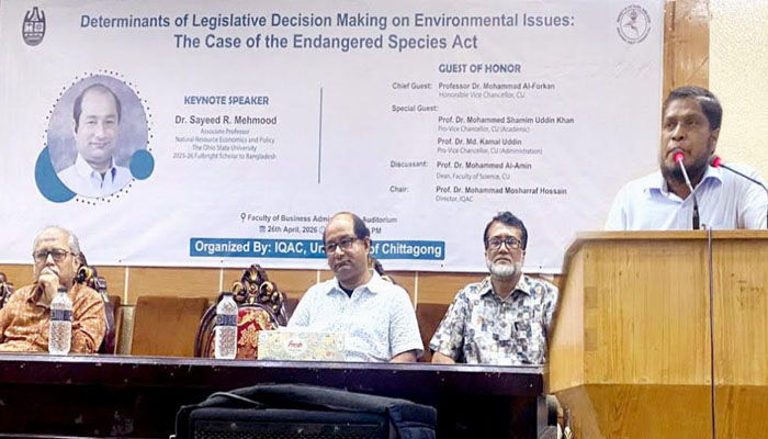 চট্টগ্রাম বিশ্ববিদ্যালয়ে ‘ডিটারমিনেন্টস অব লেজিসলেটিভ ডিসিশন মেকিং অন এনভায়রনমেন্টাল ইস্যুজ: দ্য কেস অব দ্য এনডেনজারড স্পিসিস অ্যাক্ট’ শীর্ষক এক সেমিনার অনুষ্ঠিত হয়েছে।