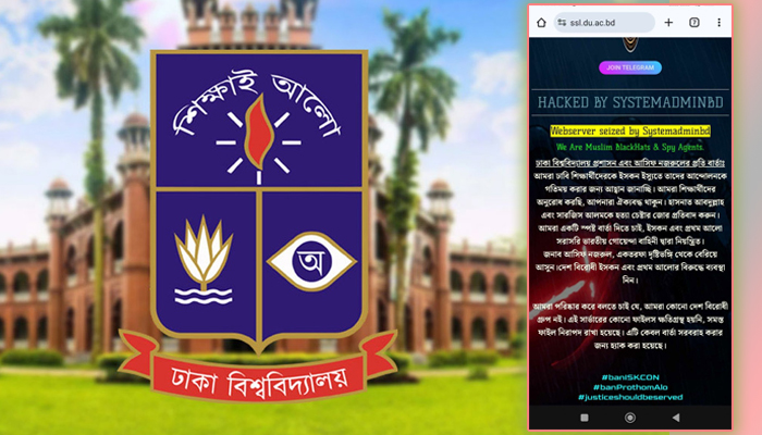 এ খবর ছড়িয়ে পড়ার পর ‘Ssl.du.ac.bd’ লিংকে প্রবেশ করলে দেখা যায় এতে ইংরেজিতে লেখা- ‘হ্যাকড বাই সিস্টেম এডমিনবিডি। উই আর মুসলিম ব্ল্যাকহ্যাটস এন্ড স্পাই এজেন্টস।’