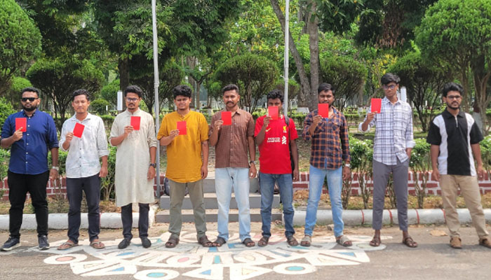 রোববার (২৬ এপ্রিল) দুপুর আড়াইটায় বিশ্ববিদ্যালয়ের প্রশাসন ভবনের সামনে মানববন্ধনের মাধ্যমে এ লাল কার্ড প্রদর্শন কর্মসূচি পালন করেন তারা।