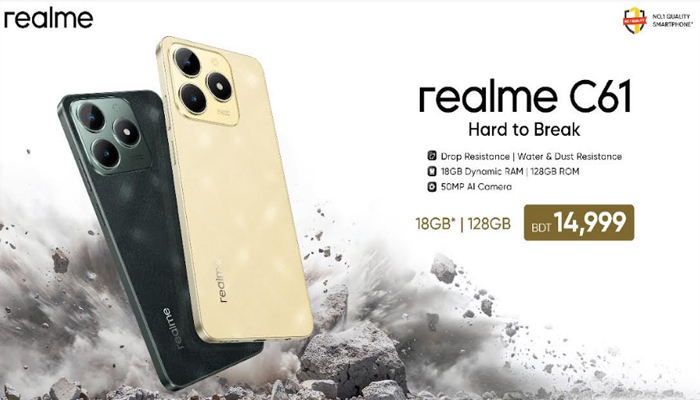 ‘হার্ড টু ব্রেক’ ট্যাগলাইন নিয়ে অল-নিউ রিয়েলমি সি৬১ উন্মোচন করেছে তরুণদের জনপ্রিয় স্মার্টফোন ব্র্যান্ড রিয়েলমি। সেগমেন্টের সেরা স্থায়িত্ব ও সর্বোচ্চ কর্মক্ষমতা নিশ্চিত করে এই স্মার্টফোন। দীর্ঘস্থায়িত্ব ও নির্ভরযোগ্যতা নিশ্চয়তা দিতে ডিভাইসটিতে রয়েছে এন্টি-ড্রপ প্রোটেকশন, ওয়াটার স্প্ল্যাশ রেজিস্ট্যান্স ও রেইনওয়াটার স্মার্ট টাচ ফিচার সক্ষমতা।