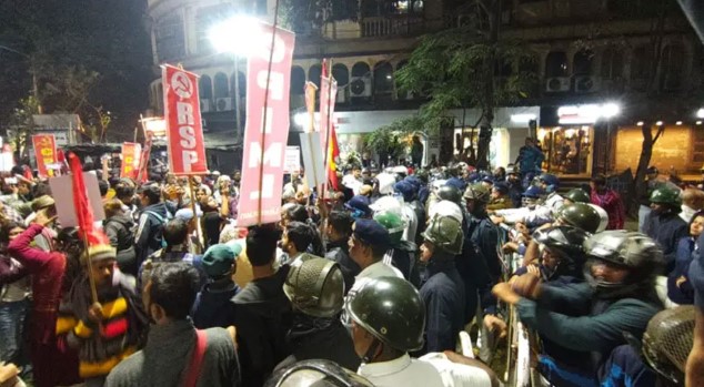 আজ মঙ্গলবার দুপুরে হিন্দুত্ববাদী সংগঠনগুলোর মিছিলের পরে কলকাতায় বাংলাদেশের উপদূতাবাসের দিকে সন্ধ্যায় মিছিল করেছেন বামপন্থি দলগুলোর নেতাকর্মীরা। দুপুরের মতোই এদের মিছিলও উপদূতাবসের দুশো মিটার আগেই থামিয়ে দেয় পুলিশ।