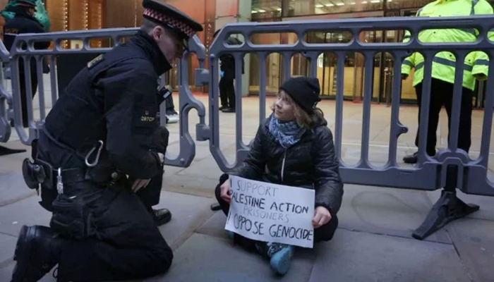 ফিলিস্তিনের সমর্থনে বিক্ষোভে অংশ নেওয়ায় সুইডিশ মানবাধিকারকর্মী গ্রেটা থুনবার্গকে গ্রেপ্তার করেছে যুক্তরাজ্যের পুলিশ। গতকাল মঙ্গলবার গ্রেপ্তারের সময় থুনবার্গকে ফিলিস্তিনের পক্ষে একটি প্ল্যাকার্ড ধরে রাখতে দেখা যায়।