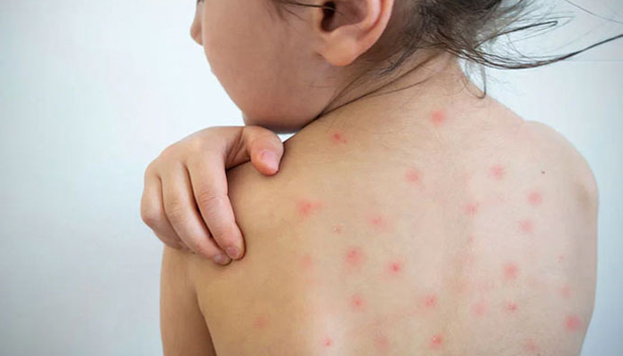 * লাল দাগের র‍্যাশ। কিছু দাগ সামান্য উঁচু হয়। সাধারণত মুখ বা চুলের গোড়া থেকে শুরু হয়ে শরীরের বাকি অংশে ছড়িয়ে পড়ে।