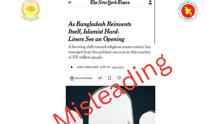 সম্প্রতি নিউ ইয়র্ক টাইমসের একটি প্রতিবেদন প্রকাশ হয়েছে। প্রতিবেদনটিতে বাংলাদেশ সম্পর্কে একটি ‘উদ্বেগজনক ও একপেশে দৃষ্টিভঙ্গি’ তুলে ধরা হয়েছে, যা থেকে বোঝা যায় দেশটি ‘ধর্মীয় চরমপন্থার কবলে পড়ার দ্বারপ্রান্তে’ রয়েছে। এই চিত্র কেবল দেশের রাজনৈতিক ও সামাজিক গতিশীলতাকে অতিসরলীকরণই করে নয় বরং ১৮ কোটি মানুষের পুরো জাতিকে অন্যায়ভাবে কলঙ্কিত করার ঝুঁকিও তৈরি করে বলে মনে করছে অন্তর্বর্তীকালীন সরকার।