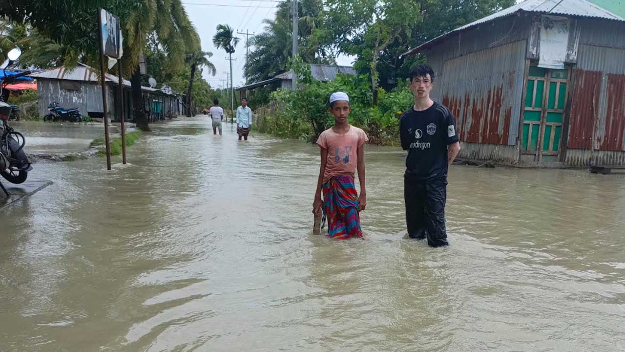 বসতঘরের ভেতরে হাঁটুপানি, রান্নাঘর থেকে উঠান—সবই এখন পানির রাজত্বে। স্তব্ধ চোখে দাঁড়িয়ে আছেন নিঝুমদ্বীপের বাসিন্দা মো. মিলন। তার চোখে হতাশা, মুখে কথা নেই। স্ত্রী-সন্তান ঠাঁই নিয়েছেন খাটের উপর, গবাদিপশুগুলো কোনোভাবে টিকে আছে গ্রামীণ কাঁচা সড়কে। চারদিকে শুধু পানি আর নীরবতা—যেন নিঝুমদ্বীপের প্রতিটি ঘরেই এখন এমন করুণ চিত্র।