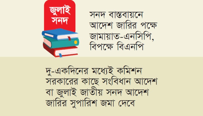 চব্বিশের গণঅভ্যুত্থান-পরবর্তী সময়ে ‘জুলাই জাতীয় সনদ’ বাস্তবায়ন নিয়ে রাজনৈতিক অঙ্গনে তৈরি হয়েছে নতুন বিতর্ক। বিএনপি ও জামায়াতে ইসলামীসহ বিভিন্ন রাজনৈতিক দলের নেতারা সনদে স্বাক্ষর করেছেন। কিন্তু, আইনি ভিত্তি স্পষ্ট না হওয়ায় সংস্কারসংক্রান্ত বেশি উৎসাহী দল জাতীয় নাগরিক পার্টি (এনসিপি) জুলাই সনদে সই করেনি। একই পথে হেঁটেছে বাম ঘরানার চারটি রাজনৈতিক দল। এখন সনদের আইনি বৈধতা নিশ্চিত করতে বিশেষজ্ঞদের পরামর্শ চূড়ান্ত পর্যায়ে রয়েছে। দু-একদিনের মধ্যেই কমিশন সরকারের কাছে সংবিধান আদেশ বা জুলাই জাতীয় সনদ আদেশ জারির সুপারিশ জমা দেবে। সেই সুপারিশের ভিত্তিতে আলাদা আদেশ জারির প্রস্তাব বিবেচনা করছে সরকার।