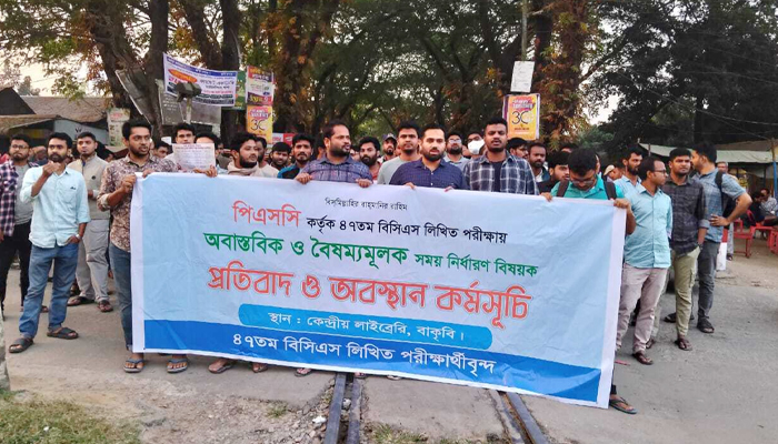 ৪৭তম বিসিএসের লিখিত পরীক্ষার সময়সূচি পেছানোর দাবিতে রেলপথ অবরোধ করে বিক্ষোভ করেছেন বাংলাদেশ কৃষি বিশ্ববিদ্যালয় (বাকৃবি) পরীক্ষার্থীরা। এর ফলে সাড়ে ৩ ঘণ্টা বন্ধ থাকে ঢাকা-ময়মনসিংহ রুটে রেল চলাচল।
