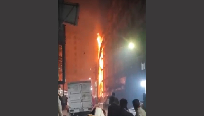 সামাজিক মাধ্যমে ছড়িয়ে পড়া একটি ভিডিওতে দেখা যায়, রাস্তার পাশের একটি বহুতল ভবনের একাংশ জুড়ে আগুন জ্বলছে।