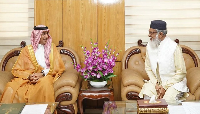 বাংলাদেশে নিযুক্ত সৌদি আরবের রাষ্ট্রদূত ড. আব্দুল্লাহ জাফর এইচ বিন আবিয়াহ’র বুধবার দুপুরে সচিবালয়ে ধর্ম উপদেষ্টা ড. আ ফ ম খালিদ হোসেনের সঙ্গে সৌজন্য সাক্ষাৎ করেন। ছবি : পিআইডি