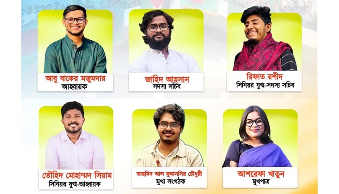 পাশাপাশি সিনিয়র যুগ্ম আহ্বায়ক লিমন মাহমুদ, সিনিয়র সদস্য সচিব আল আমিন সরকার, মুখ্য সংগঠক হাসিব আল ইসলাম এবং মুখপাত্র হিসেবে রাফিয়া রেহনুমা হৃদি দায়িত্ব পেয়েছেন।