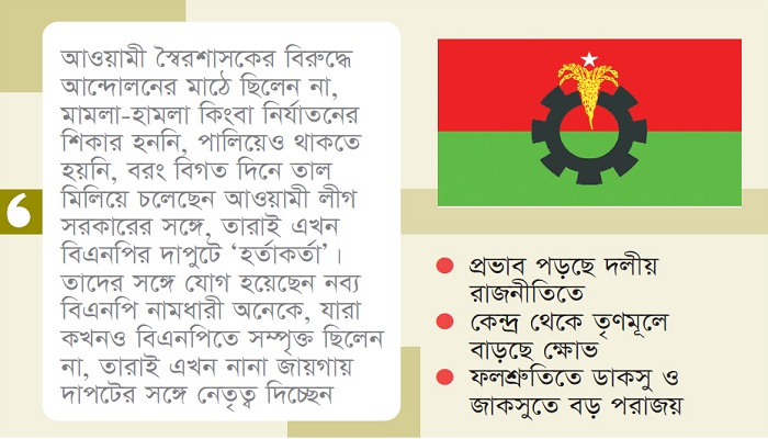 আওয়ামী স্বৈরশাসকের বিরুদ্ধে আন্দোলনের মাঠে ছিলেন না, মামলা-হামলা কিংবা নির্যাতনের শিকার হননি, পালিয়েও থাকতে হয়নি, বরং বিগত দিনে তাল মিলিয়ে চলেছেন আওয়ামী লীগ সরকারের সঙ্গে, তারাই এখন বিএনপির দাপুটে ‘হর্তাকর্তা’। তাদের সঙ্গে যোগ হয়েছেন নব্য বিএনপি নামধারী অনেকে, যারা কখনও বিএনপিতে সম্পৃক্ত ছিলেন না, তারাই এখন নানা জায়গায় দাপটের সঙ্গে নেতৃত্ব দিচ্ছেন। এসব হাইব্রিডদের আবির্ভাব ঘটায় বিএনপির ত্যাগী নেতাকর্মীরা এখন মূল্যায়িত হচ্ছেন না। অভিযোগ, দলটির হাইকমান্ডও ত্যাগী নেতাকর্মীদের দিকে দৃষ্টি দিচ্ছে না। এতে দিনদিন কেন্দ্র থেকে তৃণমূল পর্যন্ত ক্ষোভ বাড়ছে। যার প্রভাব পড়ছে দলীয় রাজনীতিতে। ফলশ্রুতিতে দিনদিন দলের সুনাম ক্ষুণ্ণ হচ্ছে।