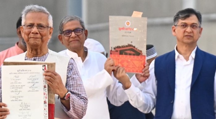 বক্তব্যের আগে প্রধান উপদেষ্টাসহ সনদে স্বাক্ষর করেন বিএনপি, জামায়াতসহ ২৫টি রাজনৈতিক দলের নেতারা।