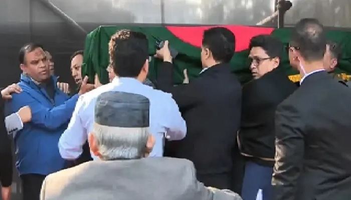 বুধবার (৩১ ডিসেম্বর) দুপুর ২টা ২৫ মিনিটে লাল-সবুজ পতাকায় আবৃত ফ্রিজার ভ্যানে করে মরদেহ নেওয়া হয়।