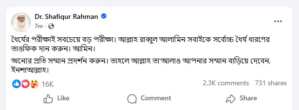 ডা. শফিকুর রহমান আরও লিখেছেন, অন্যের প্রতি সম্মান প্রদর্শন করুন। তাহলে আল্লাহ তা'আলাও আপনার সম্মান বাড়িয়ে দেবেন, ইনশাআল্লাহ।