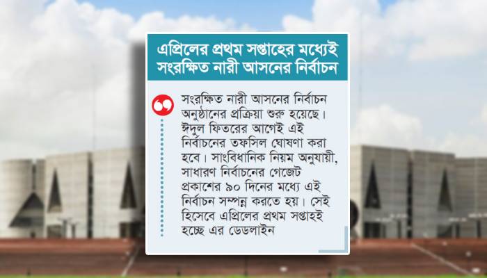 নির্বাচন কমিশনার (ইসি) আব্দুর রহমান মাছউদ জানিয়েছেন, সংরক্ষিত নারী আসনের নির্বাচন অনুষ্ঠানের প্রক্রিয়া শুরু হয়েছে। তিনি বলেন, ‘ঈদুল ফিতরের আগেই এই নির্বাচনের তফসিল ঘোষণা করা হবে। সাংবিধানিক নিয়ম অনুযায়ী, সাধারণ নির্বাচনের গেজেট প্রকাশের ৯০ দিনের মধ্যে এই নির্বাচন সম্পন্ন করতে হয়।’ সেই হিসেবে এপ্রিলের প্রথম সপ্তাহই হচ্ছে এর ডেডলাইন।