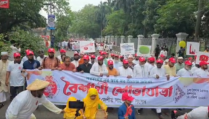 মঙ্গলবার (১৪ এপ্রিল) দেশীয় সাংস্কৃতিক সংসদের ব্যানারে প্রেসক্লাবের সামনে থেকে শুরু হওয়া শোভাযাত্রাটি রমনা পার্কে গিয়ে শেষ হয়। এতে শিশুসহ বিভিন্ন শ্রেণি-পেশার মানুষের অংশগ্রহণ ছিল।