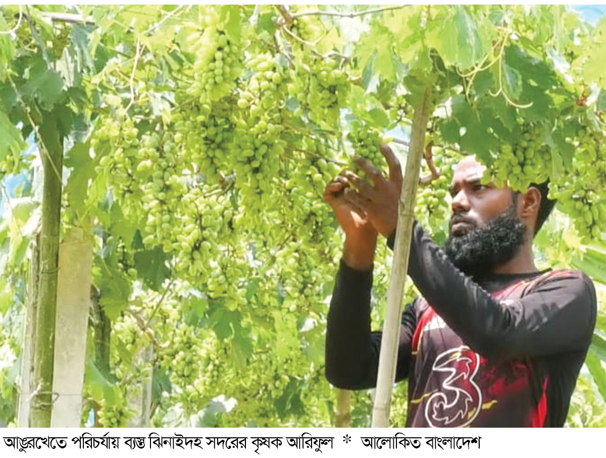 সুস্বাদু ও মিষ্টি আঙুর বাংলাদেশেও চাষ করে যে সফলতা পাওয়া যায় তারই প্রমাণ দিয়েছেন ঝিনাইদহ সদরের প্রান্তিক কৃষক আরিফুল ইসলাম। আঙুরগাছ লাগিয়ে ফলনও ভালো পেয়েছেন তিনি। সুস্বাদু আর ফলন ভালো হওয়ায় আবাদে আগ্রহ দেখাচ্ছেন এলাকার অন্যান্য কৃষকরাও। কৃষি বিভাগ বলছে, আঙুর আবাদে দেওয়া হচ্ছে নানা সহযোগিতা। সেইসঙ্গে উৎসাহিত করা হচ্ছে অন্যদেরও। সরেজমিন দেখা যায়, বাঁশের মাচায় ঝুলছে থোকা থোকা রসালো আঙুর। সবুজ পাতার ফাঁকে ফাঁকে ঝুলে থাকা সুস্বাদু এই রসালো আঙুর ফলের পরিচর্যায় ব্যস্ত কৃষক। ঝিনাইদহের সদর উপজেলার বেতাইদুর্গাপুর গ্রামের কৃষক আরিফুলের ড্রাগন বাগানে গেলে দেখা মিলবে এই মিষ্টি আঙ্গুর চাষের দৃশ্য। ২০২৩ সালে পরীক্ষামূলক ১০টি জাতের চারা রোপণ করে সফল হন কৃষক আরিফুল। সফলতা পেয়ে ২০২৪ সালে বাণিজ্যিকভাবে ১৭ শতক জমিতে আঙুর চাষ শুরু করেন। অনলাইনের মাধ্যমে ভারত ও চীন থেকে চারা সংগ্রহ করে প্রায় ১০০ গাছ লাগিয়েছেন। তার বাগানে একুলো, বাইকুনুর, ব্লাক ম্যাজিক, ভেলেজ ও সিলভাসহ কয়েক জাতের আঙুরগাছ রয়েছে। চারা রোপণের ৮ মাসের মধ্যে পেয়েছেন ফলন।