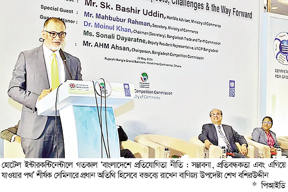 বাজারে সুষ্ঠু প্রতিযোগিতা নিশ্চিতের তাগিদ দিয়ে উপদেষ্টা বলেন, অনেক অসাধু প্রতিষ্ঠান বাজারে যোগসূত্র তৈরি করে ছোট ছোট প্রতিষ্ঠানকে ক্ষতিগ্রস্ত করছে। প্রতিযোগীদের দমিয়ে রাখতে কম দামে পণ্য বিক্রি করে তাদের ধ্বংস করছে। প্রতিযোগিতা কমিশনকে দোষীদের শাস্তি দিতে হবে। শেখ বশিরউদ্দীন বলেন, যারা ভোক্তাদের জিম্মি করে, সরকারকে ভ্যাট-টাক্স ফাঁকি দিয়ে অবৈধভাবে উপার্জন করছে তাদের বিষয়ে কড়া পদক্ষেপ দরকার। ব্যবসায়ীদেরও দেশের প্রতি দায়িত্বশীল হতে হবে। বাজারে সুষ্ঠু প্রতিযোগিতার চর্চা ও দেশের সম্পদের সুষ্ঠু বণ্টন করতে হবে। প্রতিযোগিতা কমিশনের চেয়ারম্যান এএইচএম আহসানের সভাপতিত্বে অনুষ্ঠানে বিশেষ অতিথি হিসেবে বক্তব্য রাখেন বাণিজ্য মন্ত্রণালয়ের সচিব মাহবুবুর রহমান, বাংলাদেশ ট্রেড এন্ড ট্যারিফ কমিশনের চেয়ারম্যান ড. মইনুল খান ও বাংলাদেশে ইউএনডিপির উপ-আবাসিক প্রতিনিধি সোনালি দয়ারাত্নে। বাণিজ্য সচিব মাহবুবুর রহমান বলেন, বাংলাদেশে ৫ থেকে ৬টি প্রতিষ্ঠান একই উৎস থেকে পণ্য ক্রয় করে এবং বাজারজাত করে। তাদের খরচ ও মোটামুটি একই রকম হওয়ায় বাজারে খুব বেশি প্রতিযোগিতা দেখা যায় না। বর্তমান সরকার বাজারকে প্রতিযোগিতামূলক করতে পদক্ষেপ নিচ্ছে। বাংলাদেশ প্রতিযোগিতা কমিশন ও জাতিসংঘ উন্নয়ন কর্মসূচি (ইউএনডিপি) যৌথভাবে এ সেমিনার আয়োজন করে। সেমিনারে মূল প্রবন্ধ উপস্থাপন করেন রিসার্চ অ্যান্ড পলিসি ইন্টিগ্রেশন কমিশন ফর ডেভেলপমেন্টের (র্যাপিড) চেয়ারম্যান ড. এমএ রাজ্জাক। প্যানেল আলোচনায় অংশ নেন বাংলাদেশ উন্নয়ন গবেষণা প্রতিষ্ঠানের (বিআইডিএস) পরিচালক ড. একে এনামুল হক, বাংলাদেশ প্রতিযোগিতা কমিশনের সদস্য (আইন) ড. আফরোজা বিলকিস, ফরেন কমনওয়েলথ অ্যান্ড ডেভলপমেন্ট অফিসের ইকনোমিক অ্যাডভাইজর ইসাম মোসাদ্দেক এবং মেট্রোপলিটন চেম্বার অব কমার্স অ্যান্ড ইন্ডাস্ট্রির সভাপতি কামরান টি রহমান।