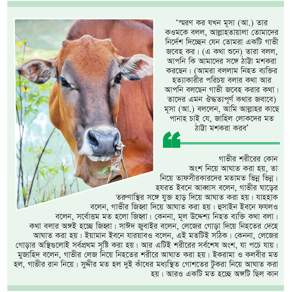 ‘অতঃপর আমি নির্দেশ দিলাম গরুটি জবাই করার পর এর একটি টুকরা দ্বারা মৃতকে আঘাত কর। এইভাবে আল্লাহ মৃতকে জীবিত করেন এবং তোমাদের তার নিদর্শনগুলো প্রদর্শন করেন, যাতে তোমরা চিন্তাভাবনা করতে পার।’ (সূরা বাকারা, আয়াত-৭৩)।